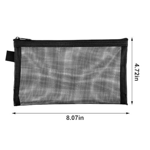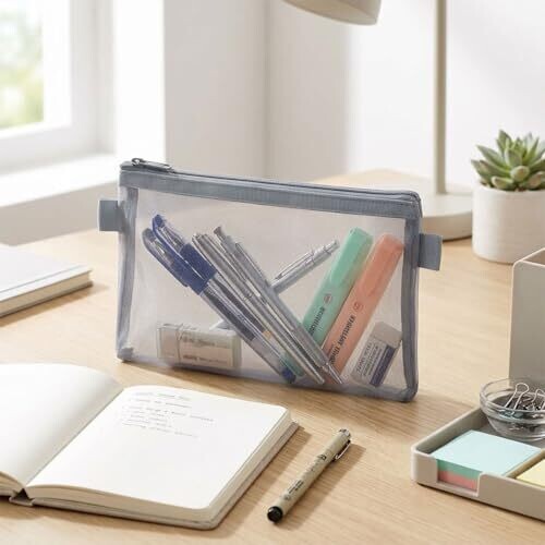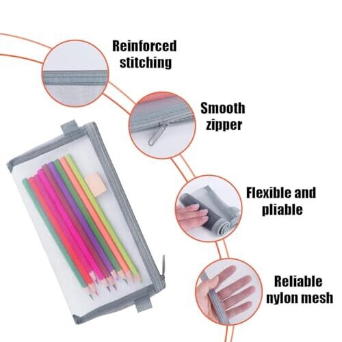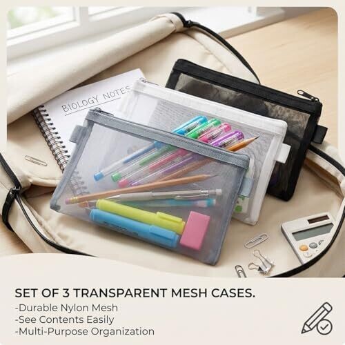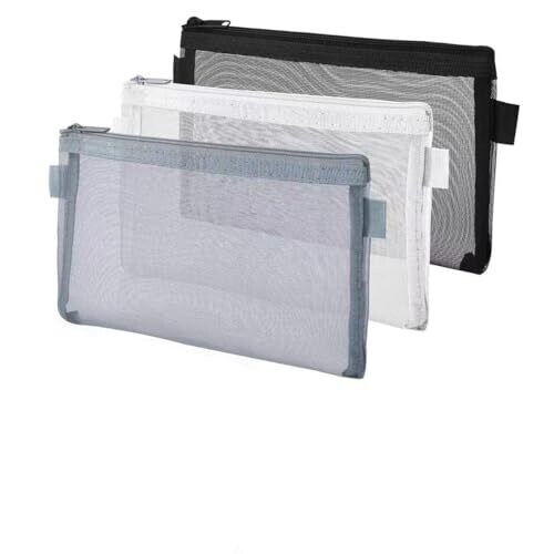 - Three separate mesh zipper pouches provide organized storage for pens, pencils, makeup, and small items.