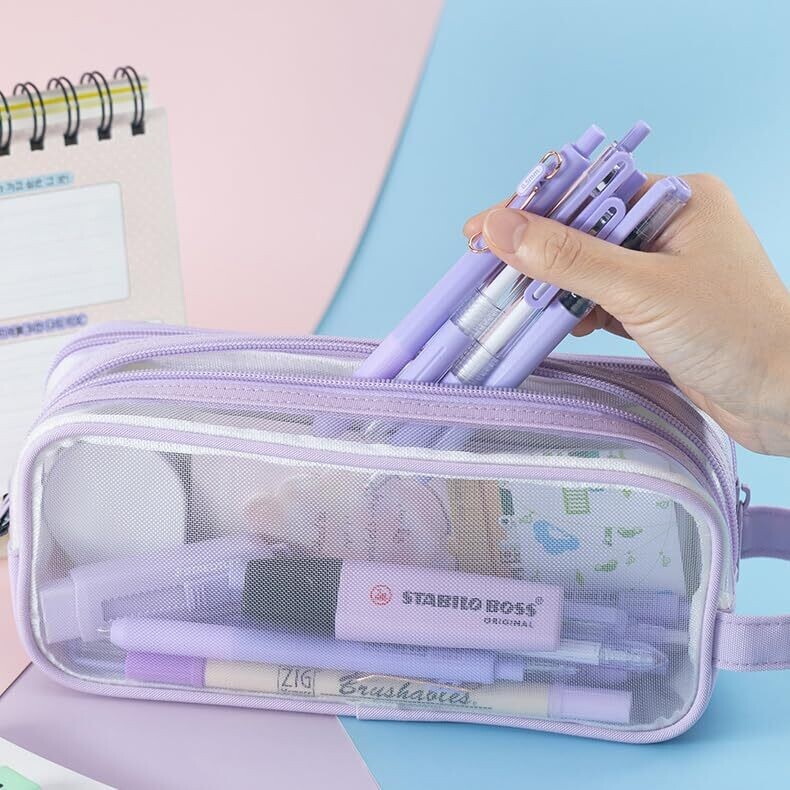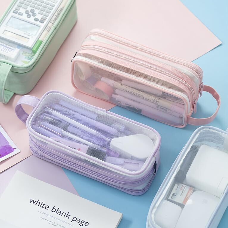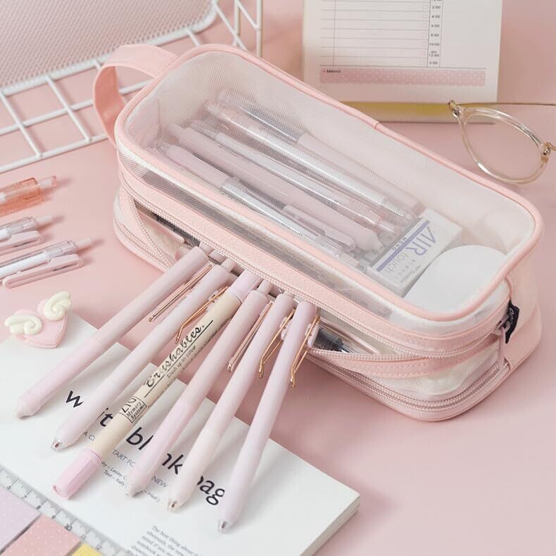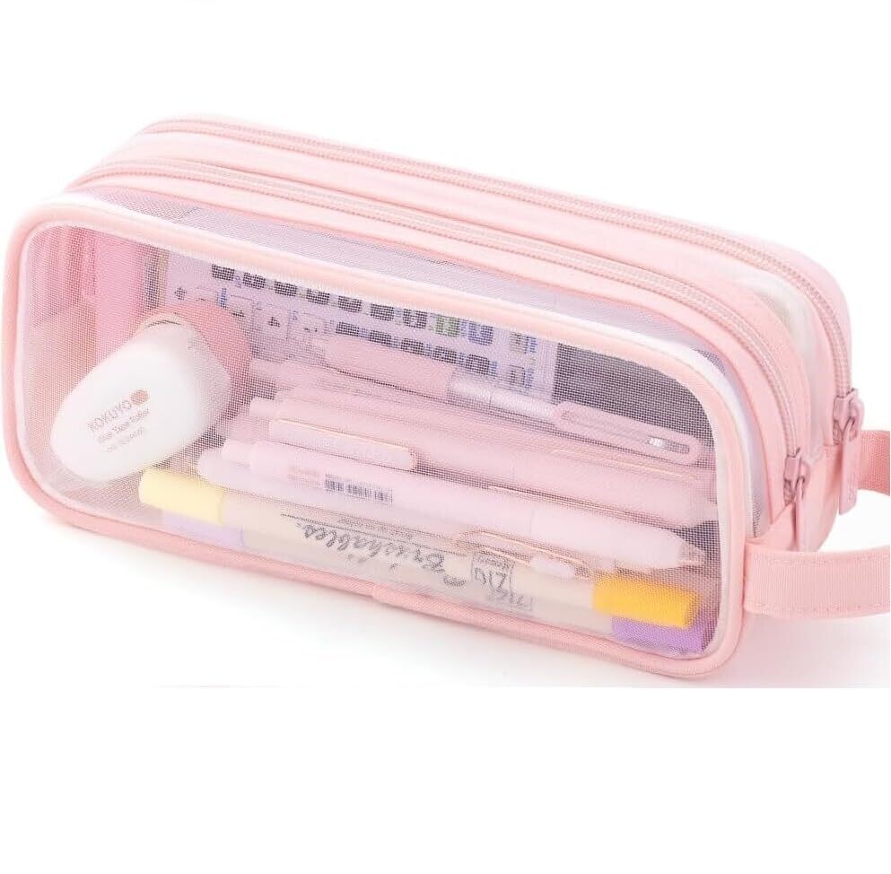 Lumina Large Clear Mesh Pencil Case Pouch, 2-Compartment, Pink