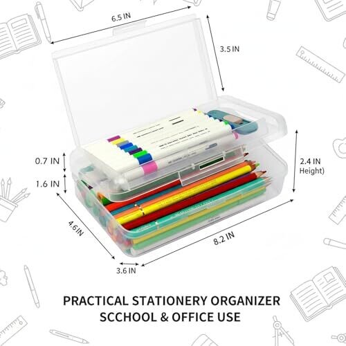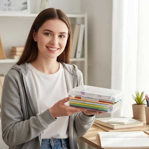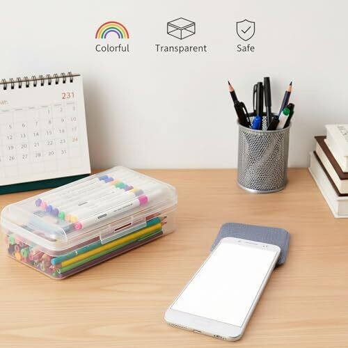 - Transparent, hard plastic pencil case designed to keep supplies visible at a glance.