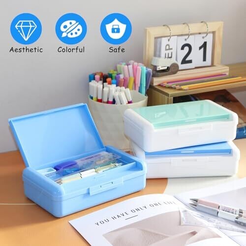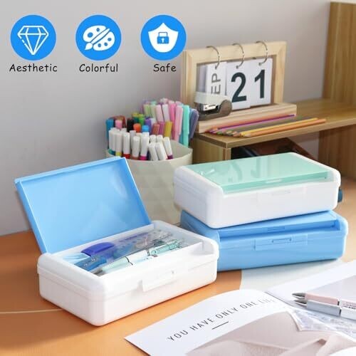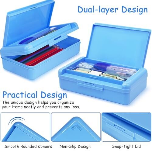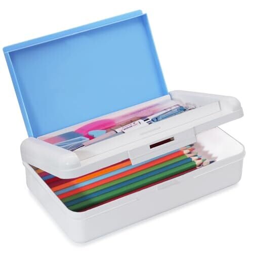 - Nuozme Double Layer Pencil Box is a hard plastic pencil case with two compartments and a snap-tight lid, designed for versatile storage and portability.