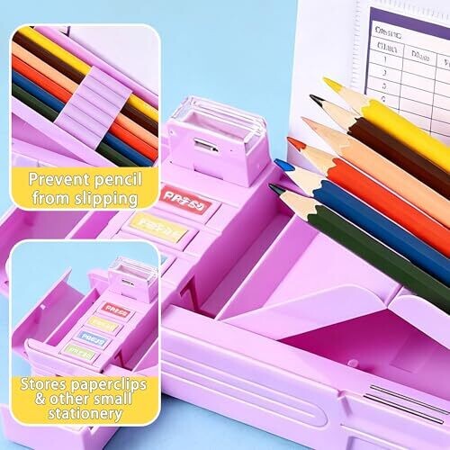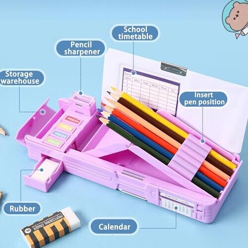 - This versatile stationery box goes beyond storage with built-in sections for pencils, a sharpener, a schedule board, and a whiteboard-friendly surface for quick notes and reminders.