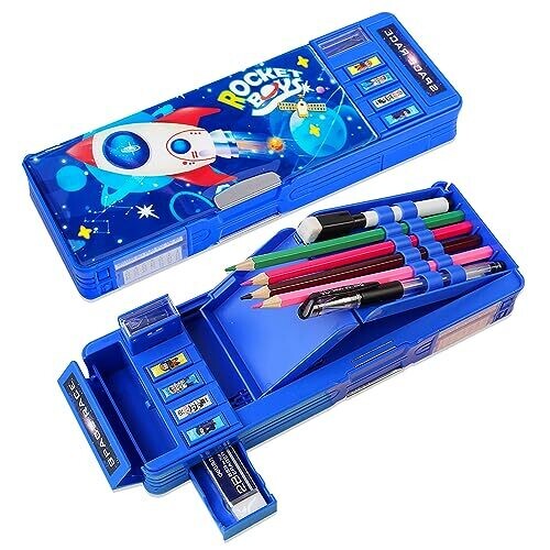 A versatile pop-up pencil case for kids that keeps pencils, erasers, and small gadgets organized. Features a built-in sharpener, schedule/whiteboard, cute rocket theme, suitable for school, travel, and as a thoughtful gift for both girls and boys.