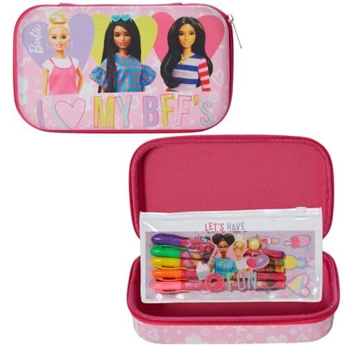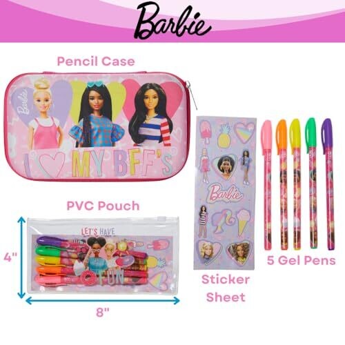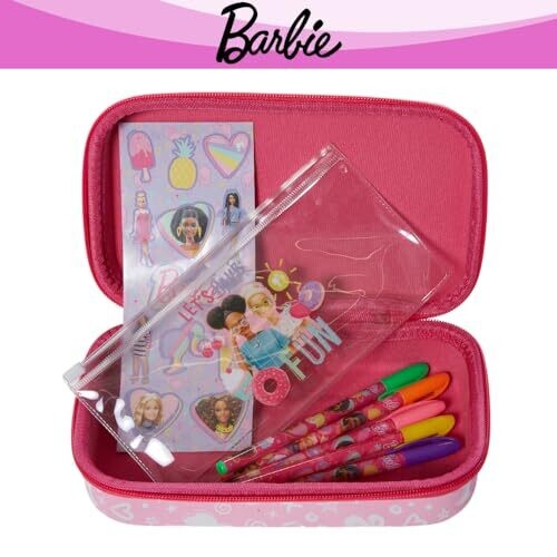 - Innovative Designs Barbie Pencil Case Set with Stickers and Gel Pens for Kids in a light pink mold—fun, functional, and ready for creativity.