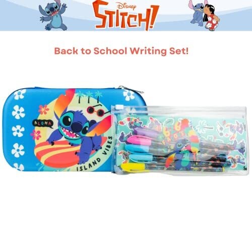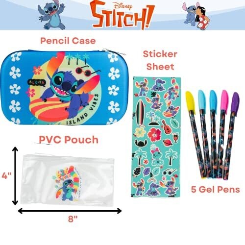 Disney Stitch Pencil Case Set with Stickers and Gel Pens for Kids - Blue