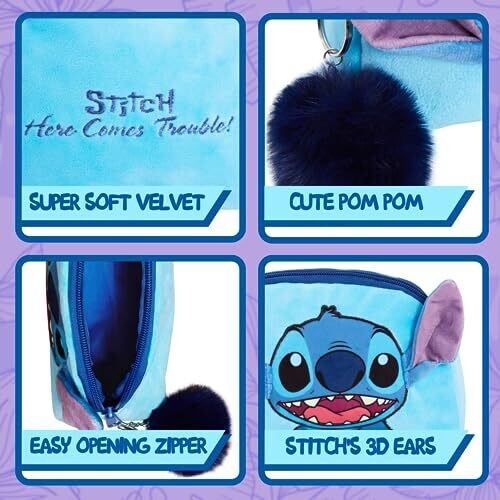 - Official Disney bag featuring a blue velvet design with Stitch imagery on one side and a coordinating reverse design.