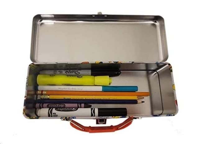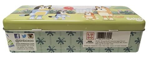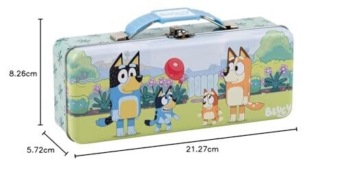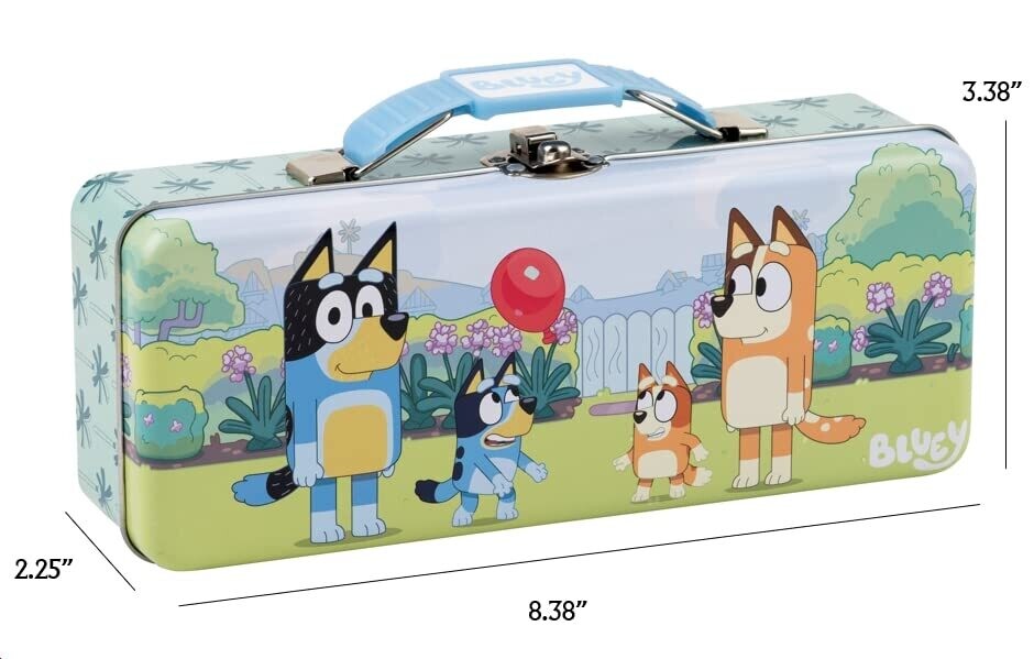 - The Tin Box Company Bluey Pencil Box with Handle Clasp & Hinge, Model: 479407-12 is a compact, portable storage solution for pencils, markers, and small supplies.