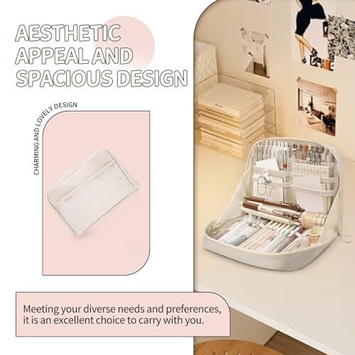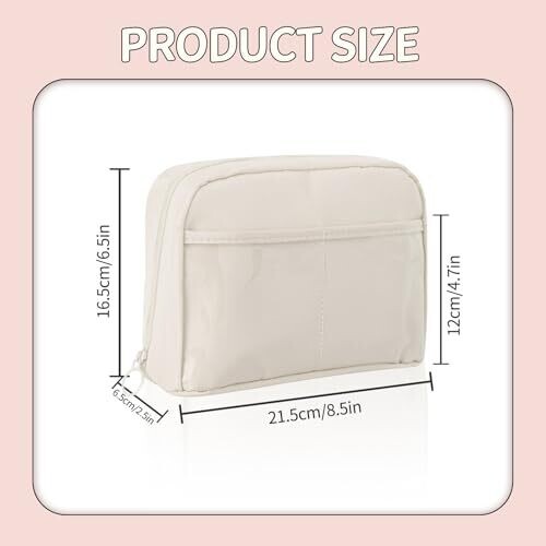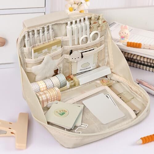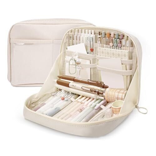 Beige White Large Capacity Pencil Case – Upright Pouch with Compartments