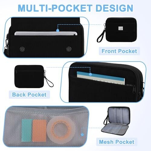 • detachable hand strap, front flap pouch, rear zipper pocket, small bottom pouches on each page