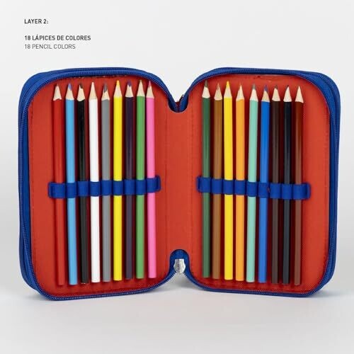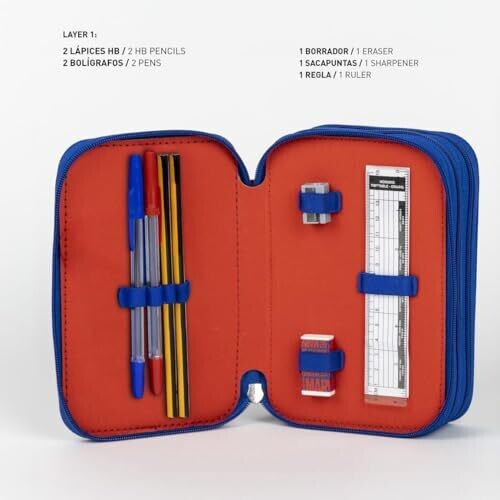 - Three distinct sections: one for daily essentials (pencils, pens, eraser, sharpener, ruler, safety scissors with a rounded tip, timetable chart), a second for colouring pencils, and a third for markers.