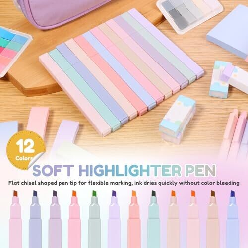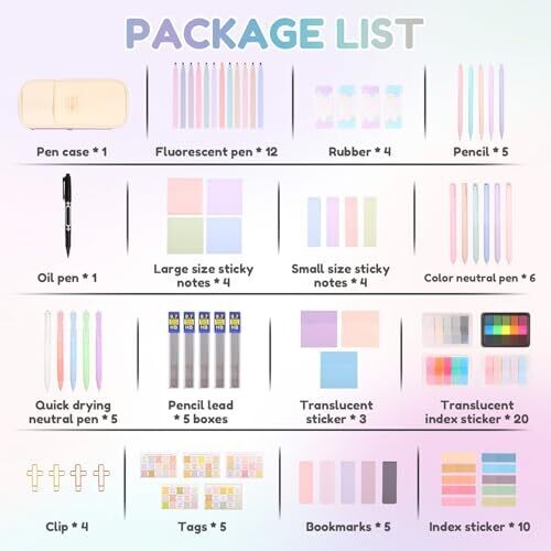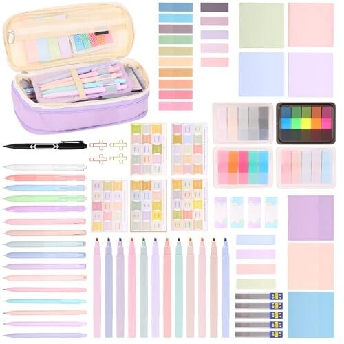 - The assortment covers essential writing and highlighting tasks with pastel highlighters, gel pens, pencils, and oil-based pens, plus a broad array of sticky notes, labels, and index tabs to streamline study workflows.