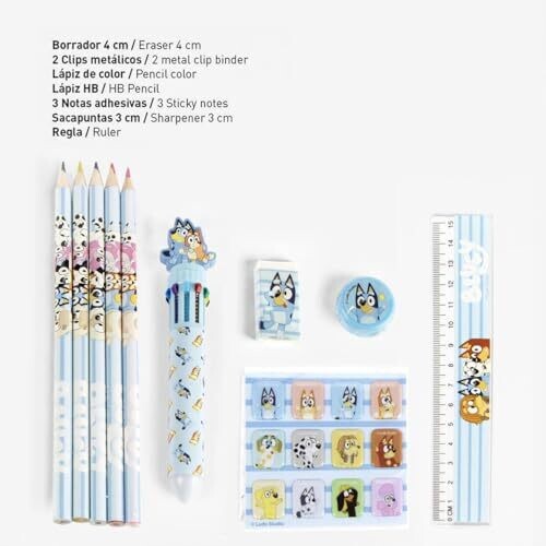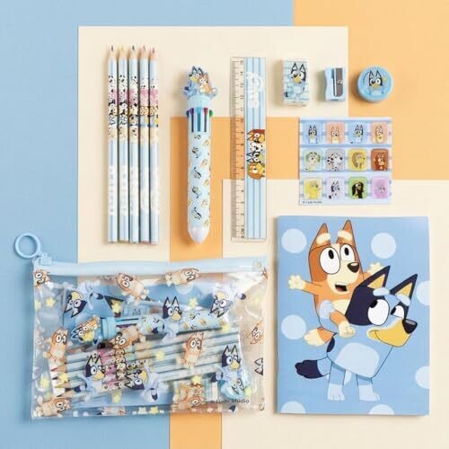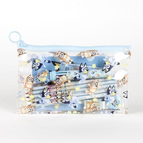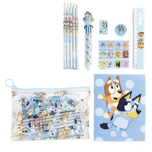 - Eva Bluey School Stationery Set offers a complete, portable art and study kit featuring Bluey-themed accessories on every item.