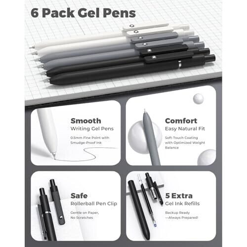 • Six smooth gel pens provide clean, quick-drying ink for fast writing and reliable everyday use.