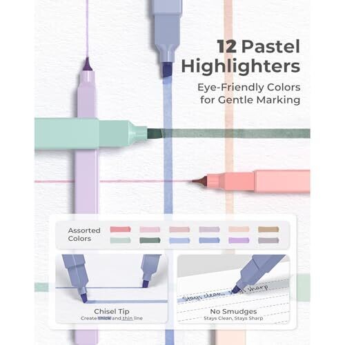 • Twelve vibrant highlighters offer color-coding for notes, textbooks, and study plans with visible, non-smudging highlights.