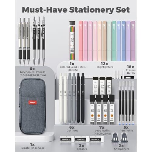 • 6 gel pens, 6 mechanical pencils, 12 pastel highlighters, black pencil pouch, 5 pen refills, 3 erasers, 18 cap erasers, 8 lead refill tubes, 2 sharpeners
