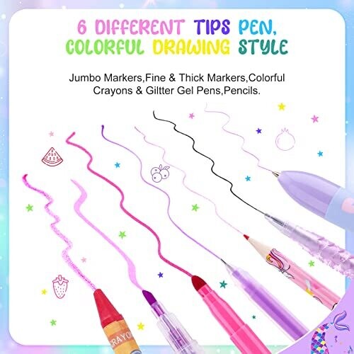 - Includes a complete selection of art supplies to fuel creativity: unicorn pencils, fruit-scented markers, crayons, double-headed markers, rainbow mermaid pens, erasers, colouring cards, a pencil sharpener, a 6-Color-In-1 pen, and a ruler.
