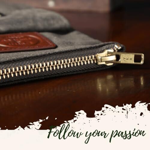 - Crafted from rugged brown waxed canvas with a sturdy brass zipper for secure tool storage.