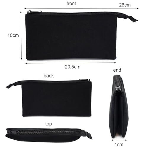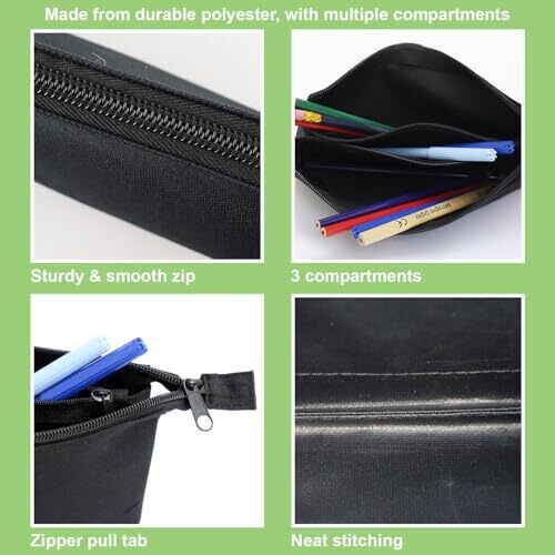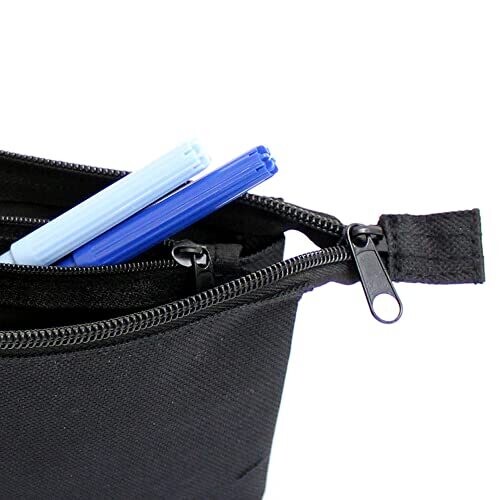 A stylish black pencil case with three pockets, camouflage inner lining, and a flat zipper. Ideal for boys, girls, teens in secondary or high school. Fits pens, pencils, erasers, and small accessories in a compact 20.5 x 10 cm pouch.