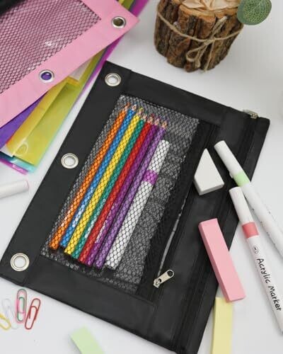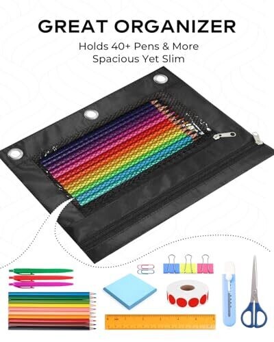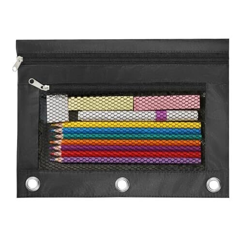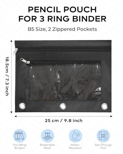 INNOIO 3 Ring Binder Pencil Pouch with 2 Zippered Pockets - B5 Black, Mesh